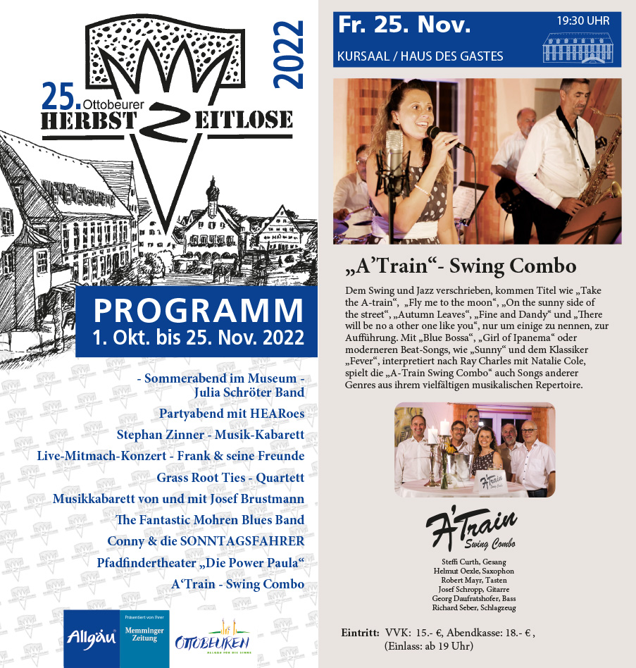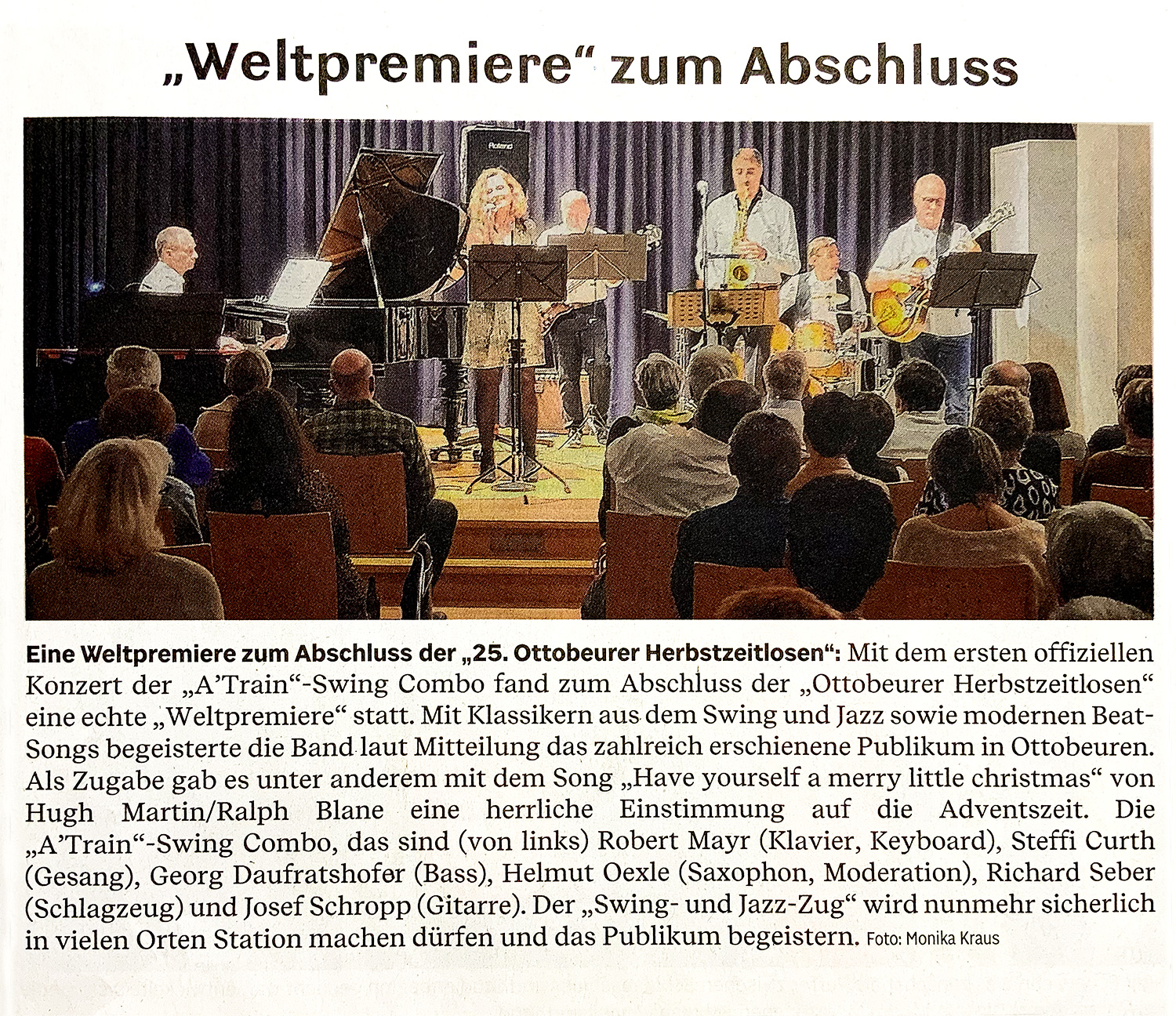 Die A-Train-Swing-Combo spielte auch das Stück, nach dem die Band benannt ist: "Take The A-Train" von Duke Ellington. Insgesamt eine harmonische Einheit aus sechs sehr guten Musikern mit absolut authentischem Sound. Mit Keyboards (Robert Mayr), Jazz-Gitarre (Josef Schropp), Bass (Georg Daufratshofer), Schlagzeug (Richard Seber) und Saxophon (Helmut Oexle) umrahmten sie Steffis feine, aber präzise Stimme. Besonders erwähnenswert das Duett "Fever" von Helmut und Steffi in laszivem Swingrhythmus, in den sich nach und nach die Instrumente einreihten. Fast jedes Stück gab den Spielern die Gelegenheit, solistisch zu brillieren und den verdienten Szenenapplaus zu ernten. Keyboard, Saxophon und Gitarre waren des öfteren an der Reihe, auf das Schlagzeugsolo musste man länger warten. Das fiel aber umso fulminanter aus.